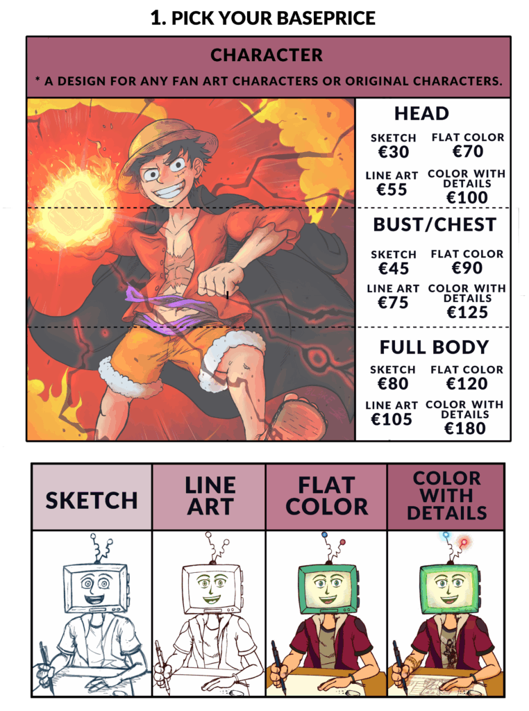 The prices for my commissions are based on a digital commission for one character and A3, A4 and A5 as the canvas formats.